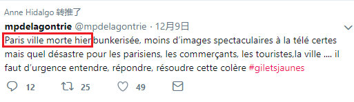 12月8日的Act4抗議結束後,巴黎市長Anne Hidalgo轉發了一位巴黎議員的推特,裏面寫道: