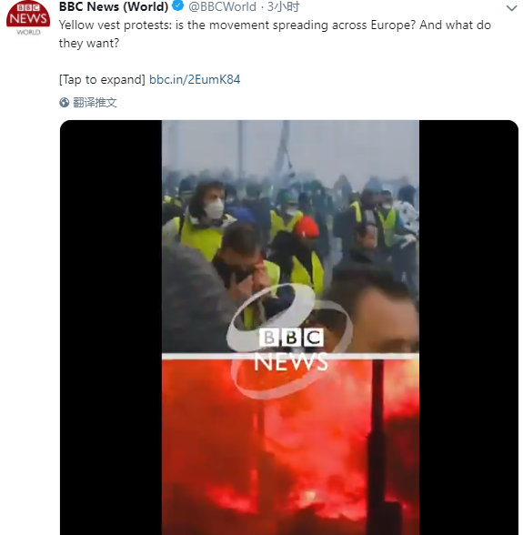 BBC沒有第一時間報道此事,但恰巧發佈了一段視頻:黃馬甲抗議行動會擴散到歐洲嗎?他們到底想要啥?