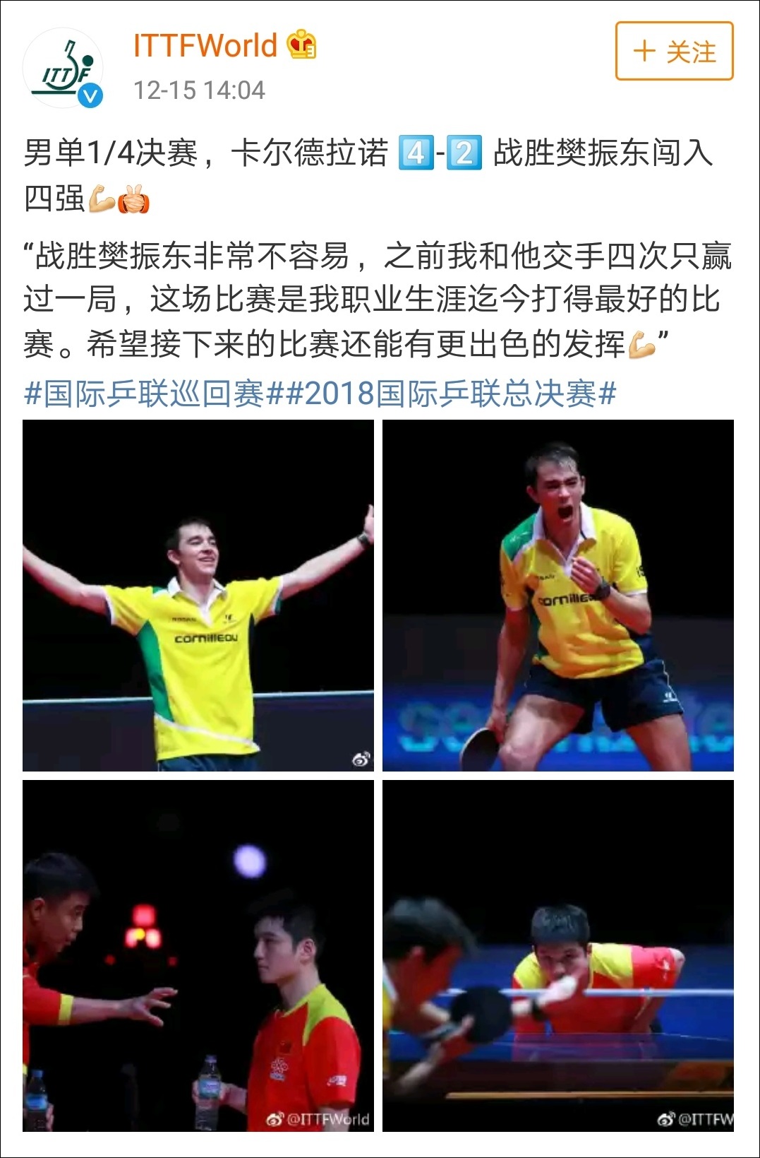 2018年12月15日國際乒聯巡迴賽總決賽男子單打1/4決賽迎來一場重量級的較量。現世界排名第一的中國樊振東VS巴西雨果.卡爾德拉諾。這場比賽樊振東如果獲勝將在半決賽與日本張本智和進行強強對話,這將是中國與日本乒乓球最高水平的比拼,同時也是2018年的收官之戰。