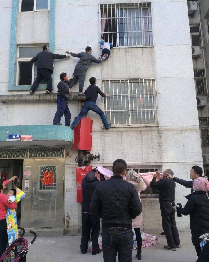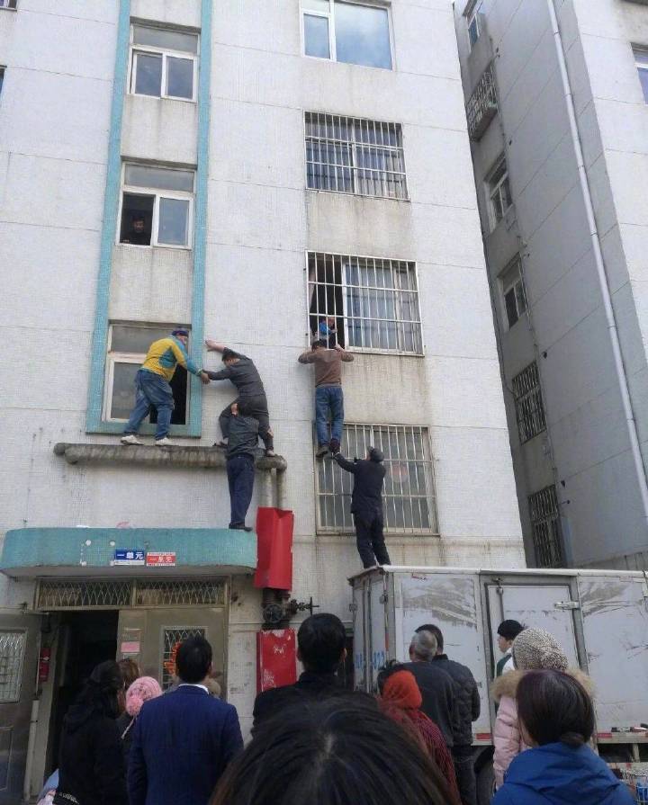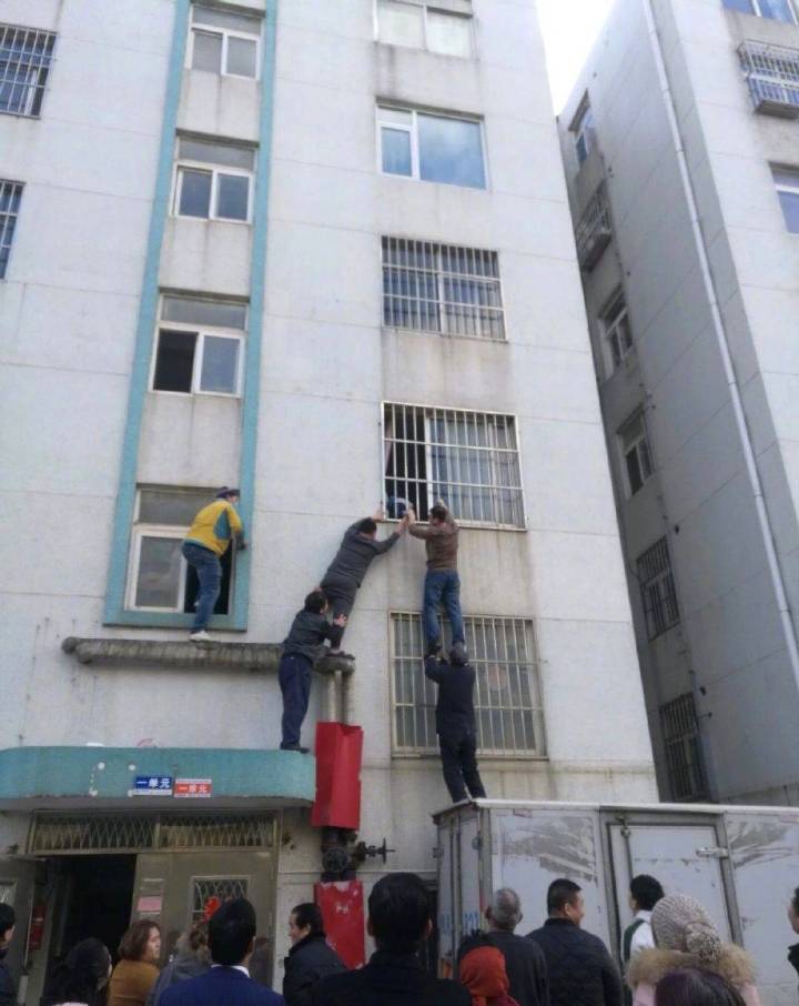 小孩的鄰居孔豔魯聞訊後,直接從樓道的窗户爬到樓外,踩在牆外的管道上,一手扒着窗台,一手託着孩子雙腳。