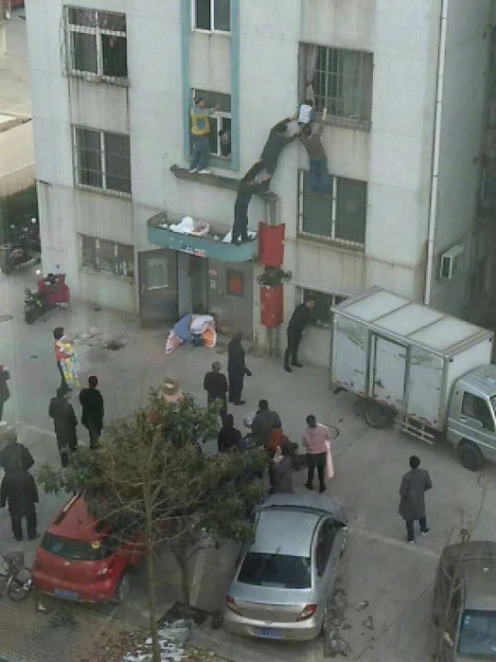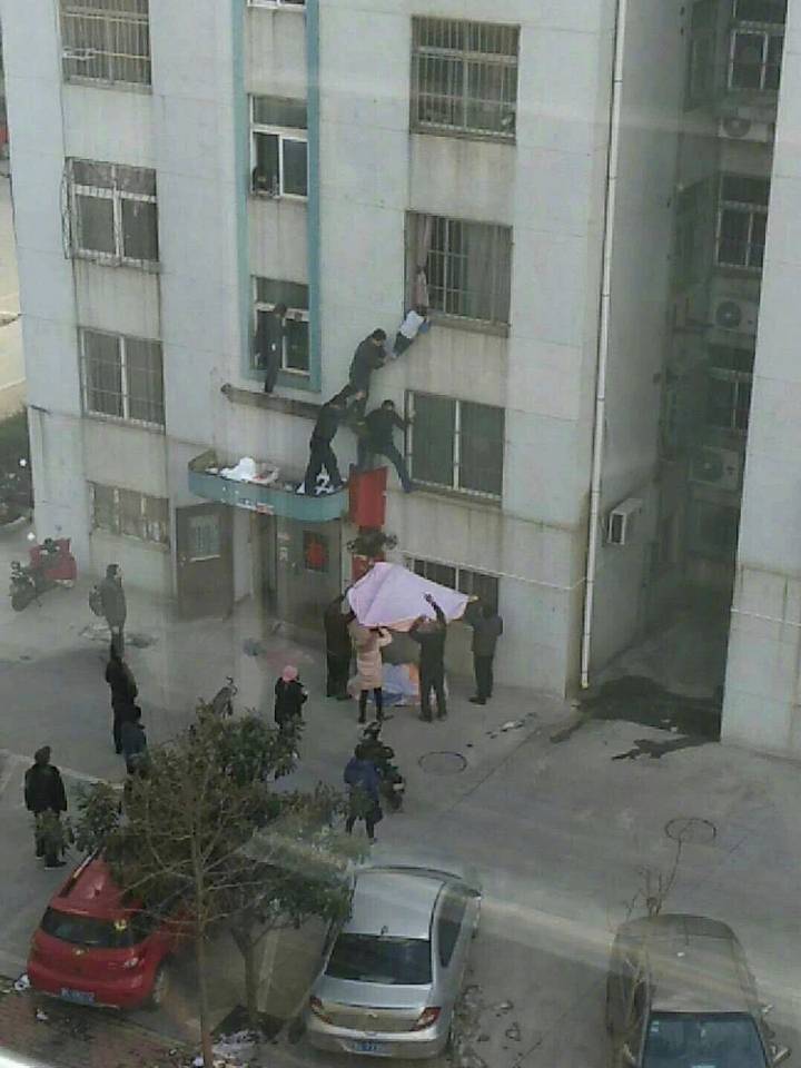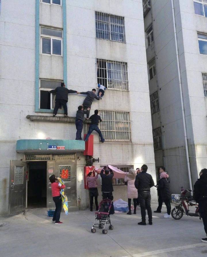 孔祥峯和鄰居扶住孩子的雙腿,同時孔豔魯用雙手托住孩子。一位卡車司機路過,直接將廂貨車停到樓下,幾位鄰居爬上去,從另一個方向托住孩子。