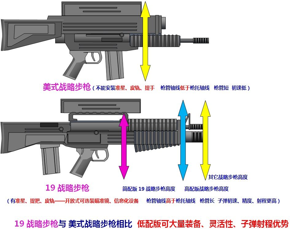 (如果美式戰略步槍、19式都拆掉上方的電子觀瞄設備,兩者都成為簡化版戰略步槍,則19式高度明顯更低,理由無非是充分利用了槍管下方彈匣前面的空間。