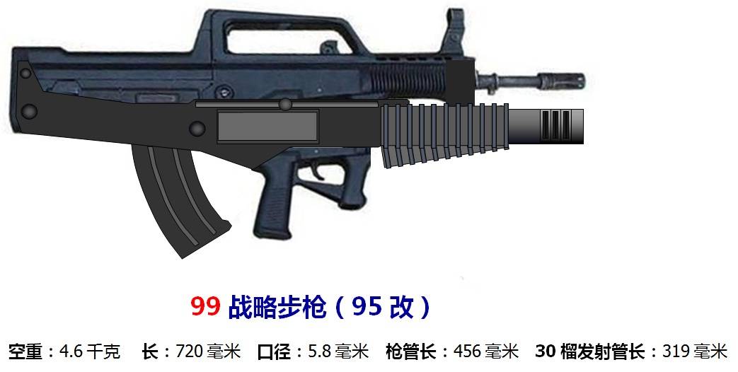 2、榴彈精度提升——通過改良95自動步槍,將扳機下移,騰出槍管和扳機之間的空間,增加30毫米單管榴彈發射管,用這種騰出空間的方法,加長髮射管,保證榴彈發射管的長度、初速、精度,同時壓低榴彈發射管軸心高度,讓其後坐力能擊中在槍托中心線,提高精度,簡化了連續射擊時的瞄準。