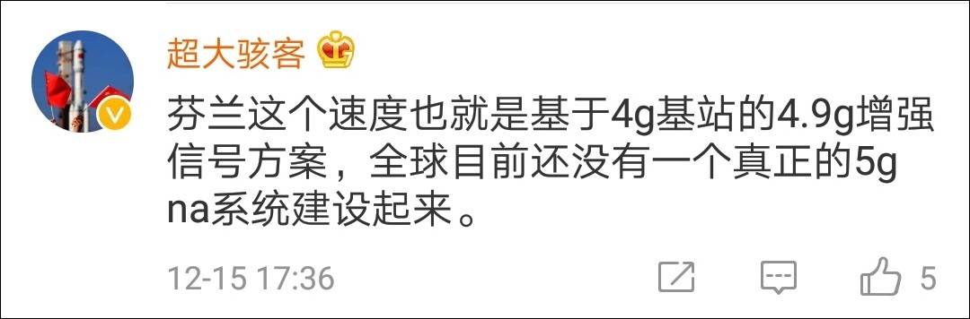 據芬蘭媒體報道稱,該國運營商Elisa已經正式宣佈商用5G網絡,並且還推出了全球首個5G移動套餐,每月收費50歐元(約400元人民幣),無限量的使用5G流量。其網速最高可以達到600Mbps(75MB/s)。