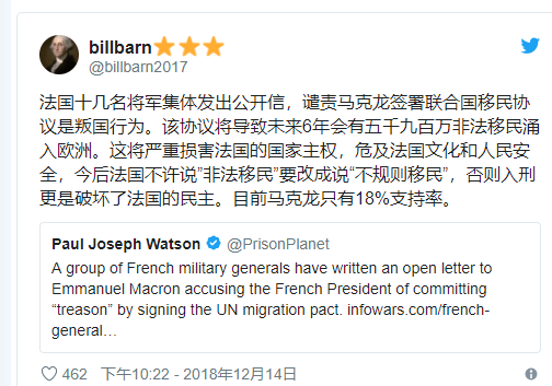 自12月15日起一則格外“生猛”的消息震驚了我這個從9歲就開始學習法語、長期關注法國話題的“老法語黨”:這些消息稱“近日,法國十幾名將軍集體發出公開信,譴責馬克龍簽署聯合國移民協議是叛國行為”,還稱該協議“將導致未來6年會有5900萬非法移民湧入歐洲,這將嚴重損害法國的國家主權,危及法國文化和人民安全”。有的賬號更進而宣稱,“今後法國不許説‘非法移民’要改成説‘不規則移民’,否則將被判刑”。