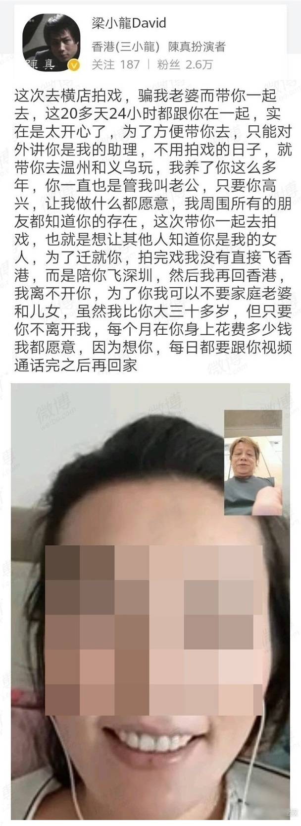 截圖顯示,梁小龍稱:“這次去橫店拍戲,騙我老婆而帶你一起去,這20多天24個小時都跟你在一起,實在是太開心了,只要你高興,讓我做什麼都願意。我周圍所有的朋友都知道你的存在,這次帶你一起去拍戲,也就是想讓其他人知道你是我的女人。我離不開你,為了你我可以不要家庭老婆和兒女,雖然我比你大三十多歲,但只要你不離開我,每個月在你身上花費多少錢我都願意,因為想你,每日都要跟你視頻通話完之後再回家。”文末還附上一張梁小龍與某女士的聊天記錄。