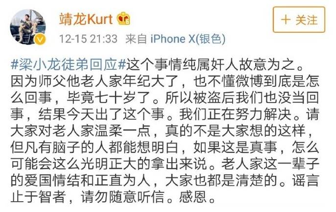 事情發生後,有一位自稱是梁小龍徒弟的靖龍,亦在微博代師傅澄清,稱梁小龍微博在一個月前就已經被盜,希望大家不要信謠傳謠,並直言必要時會採取法律行動。