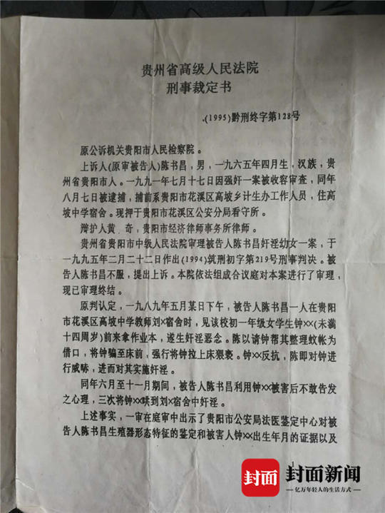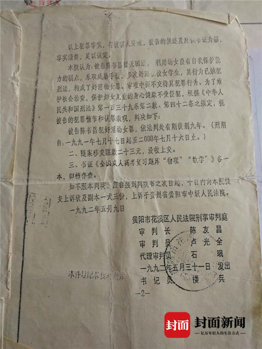 從蓬興明、陳書昌出具的花溪區法院判決書顯示:蓬興明、陳書昌均被花溪區人民檢察院指控犯奸淫幼女罪;同年5月31日,花溪區法院分別以蓬興明、陳書昌犯強姦罪,判處二人有期徒刑九年。