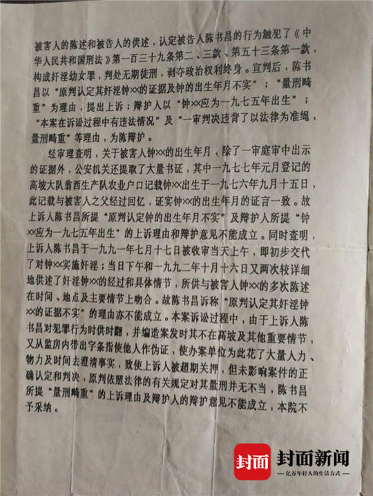 封面新聞記者從這兩份判決書中注意到,陳書昌對鍾某某第一次實施性侵時間為“一九八九年五月某日”,地點在陳書昌未婚妻劉娟的寢室。此後,陳書昌又於“一九八九年九月、一九九0年十月”,“又先後兩次將鍾某某叫到其未婚妻的寢室和自己家中進行姦淫”。