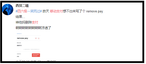 四級翻譯題裏,涉及到了中國移動支付市場(Chinese mobile payment market)。但這幾個詞可能也是太過於生僻,尤其是中國移動和移動支付,學子們不懂也是情有可原。畢竟我們的日常生活裏只有微信支付(WeChat pay)和支付寶(Alipay)。