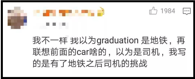 再比如,把graduation畢業認成是地鐵,直接寫成有地鐵後司機的挑戰的。