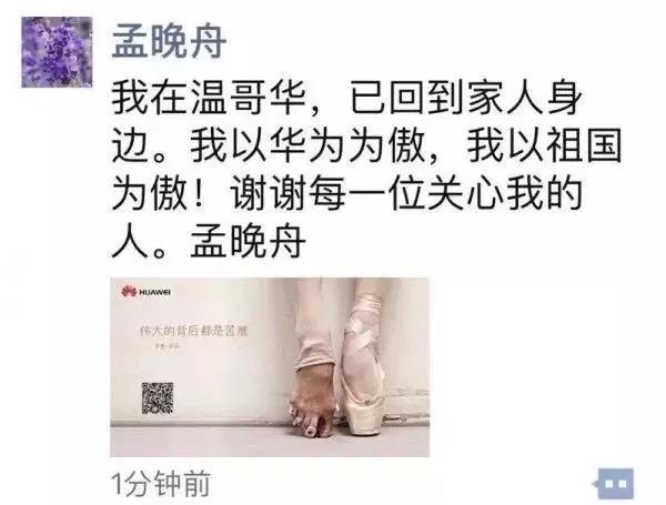 12日下午,孟晚舟被保釋後,發了一條朋友圈: