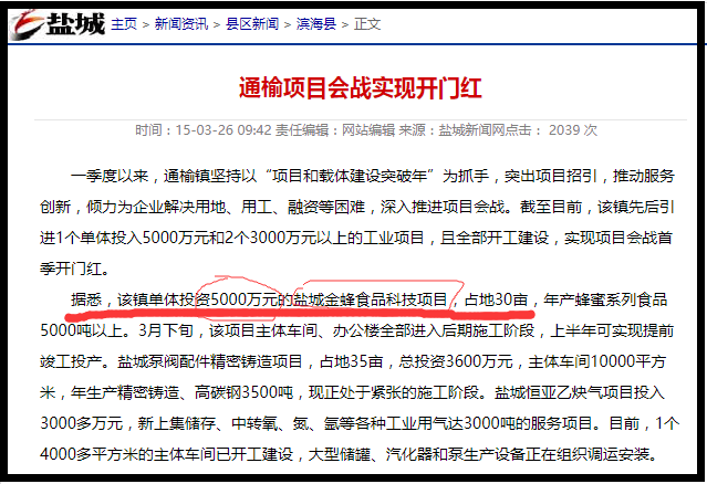 值得注意的是,根據鹽城新聞門户網站的記錄。金峯食品科技有限公司曾是當地的投資重點項目,在15年的一份報道里明確標記着,單體投資過5000萬元,佔地30畝,實現項目會戰開門紅。