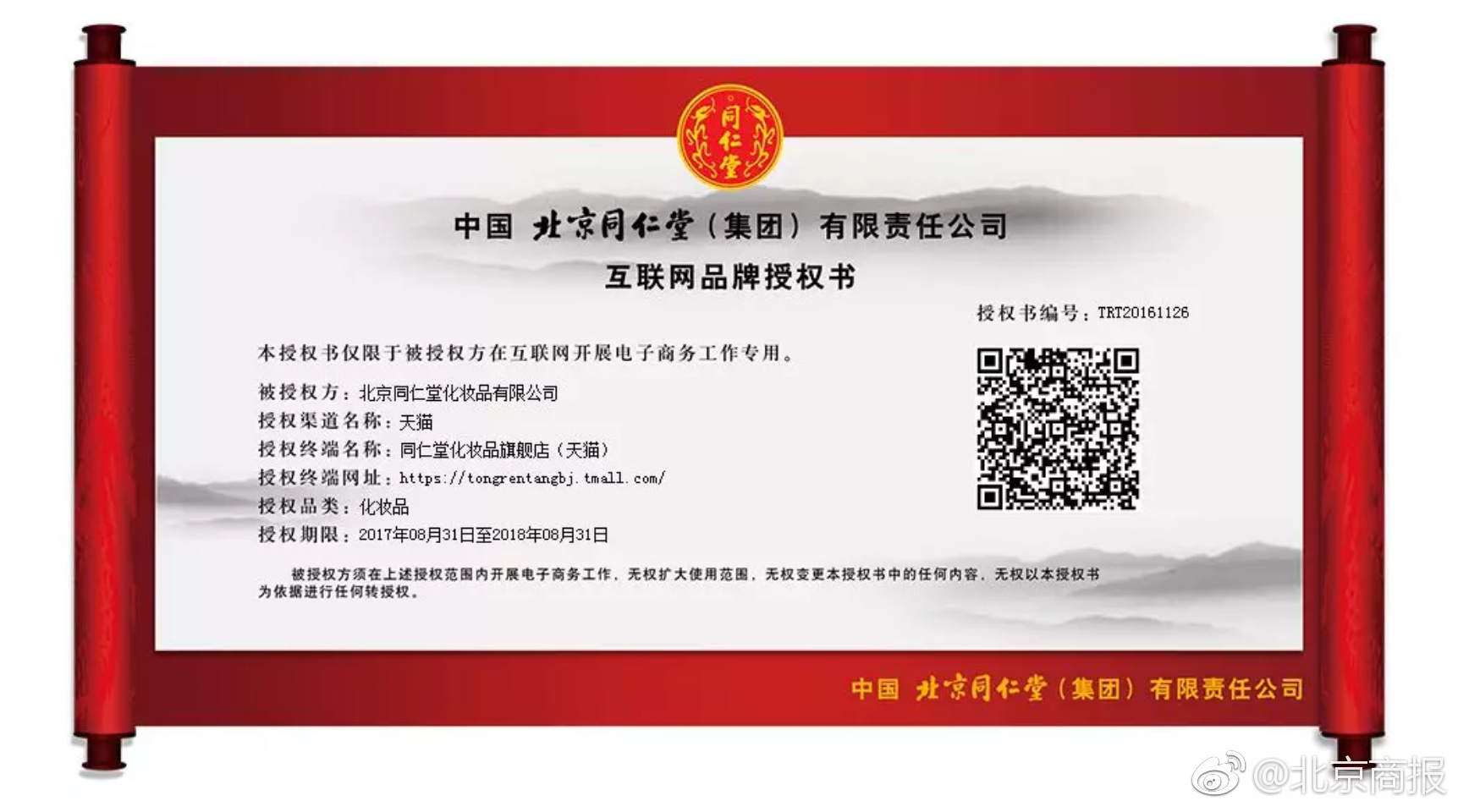 另外,根據北京同仁堂的授權信息,天貓化妝品旗艦店的授權時間為2017年8月31日到2018年8月31日。