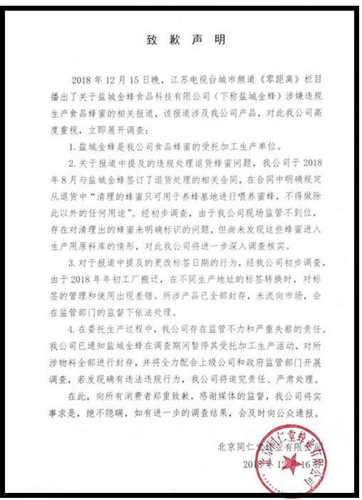 12月15日晚,江蘇廣電總枱城市頻道“南京零距離”欄目在新浪微博發佈視頻,曝光了鹽城金蜂食品科技有限公司涉嫌違規生產食品蜂蜜。在視頻中,多名工人將大量的過期,或者臨近過期的蜂蜜,倒進“倒蜜”大桶裏回收。原蜂蜜外包裝上的“同仁堂”標籤被撕下。