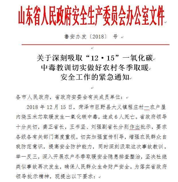 2018年12月15日,菏澤市鉅野縣大義鎮程莊村一農户屋內燒玉米芯取暖發生一氧化碳中毒,造成6人死亡。省政府領導十分關切,龔正省長,王書堅、劉強副省長分別作出批示,要求各級各有關部門高度重視,切實加強宣傳引導,增強農民羣眾自我防範意識,提高安全防護能力,同時深刻汲取這次事故教訓,舉一反三,深入開展農户冬季取暖安全隱患排查整治,堅決杜絕類似事故再次發生,確保人民羣眾生命財產安全。為落實省政府領導批示精神,現提出以下要求: