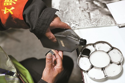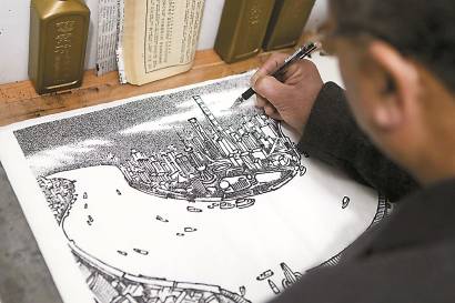 晚上9時之後相對空閒,馬一寶倒墨水,準備開始畫畫。