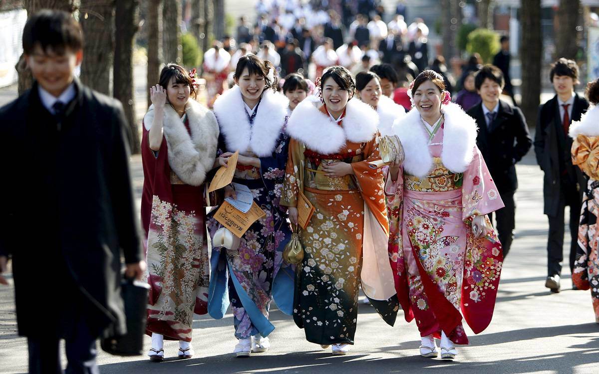 2016年1月11日,日本東京,年輕女子穿着和服參加一個遊樂園參加紀念日慶祝活動。根據政府公告,1995年日本僅120萬新生兒,標誌着日本少子化時代的開始 /Reuters