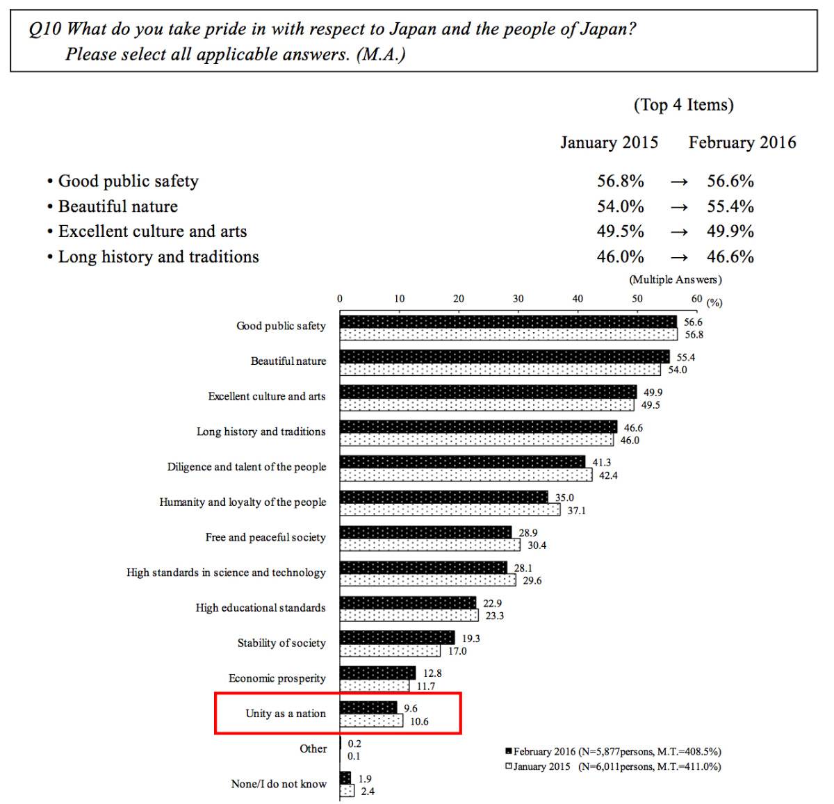 2016年內閣府大臣官房政府廣報室出版的民意調查顯示,日本人的對國家的自豪感因素排名前三的分別是:良好的社會治安、優美的自然環境以及卓越的文化藝術。而與真正與國家相關的因素:”團結一體的國家“只排到了第12名。