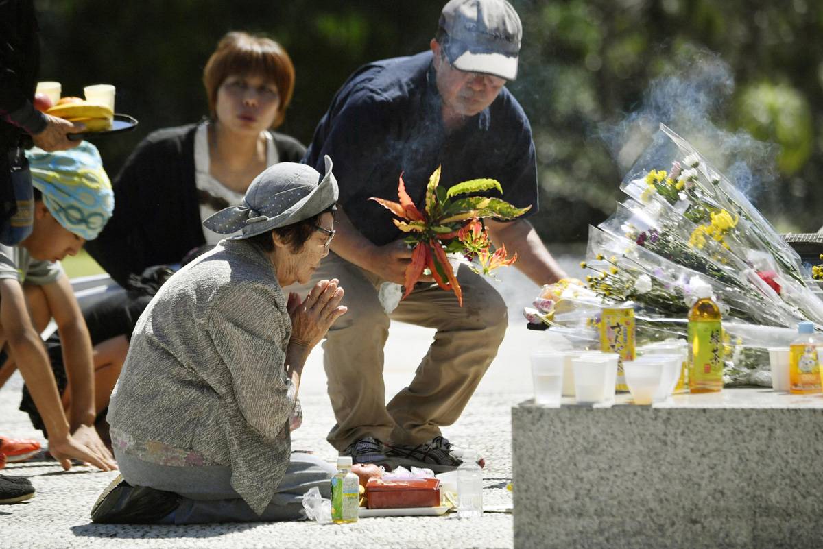 日本沖繩戰役紀念碑前為受害者禱告的老人 /KYODO