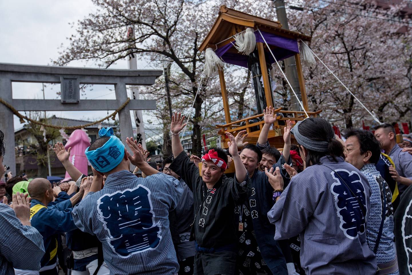 2014年4月6日,日本川崎,當地民眾慶祝神道生育節到來,人們抬着粉色的巨型男性生殖器模型遊行 /視覺中國