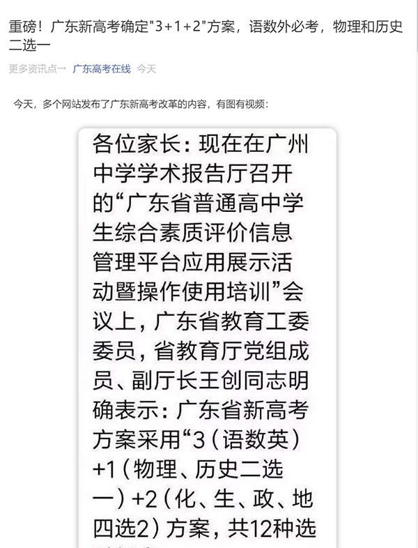 12月17日,有微信公眾號推送文章《重磅!廣東高考確定“3+1+2”方案》,引起了廣泛議論。