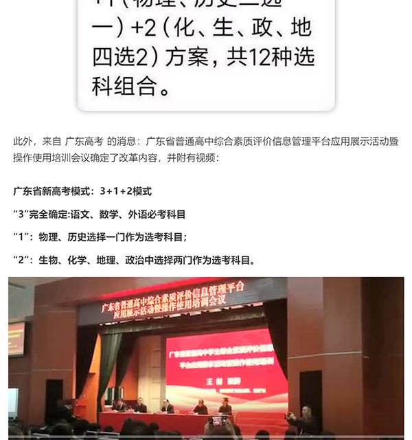 上述微信文章稱,在12月17日舉辦的廣東省普通高中綜合素質評價信息管理平台應用展示活動暨操作使用培訓會議確定,廣東省新高考模式確定由“3+3”的20種組合,變為“3+1+2”的12種組合模式。“3”完全確定為:語文、數學、外語必考科目;“1”為物理、歷史選擇一門作為選考科目;“2”為生物、化學、地理、政治中選擇兩門作為選考科目。