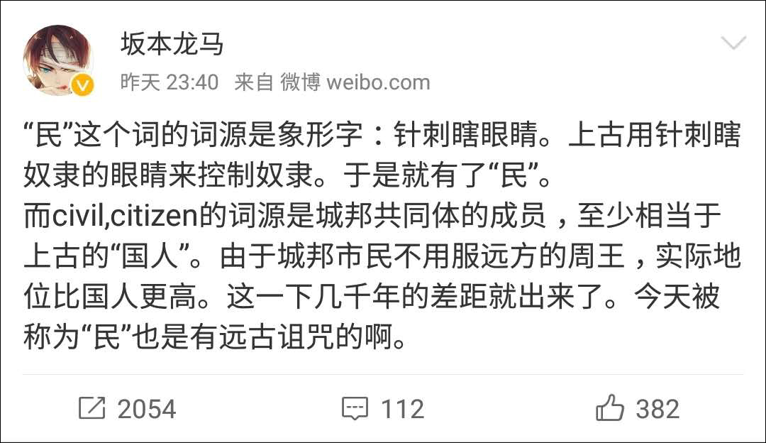 博主説的這段話將“中國文字的民起源於刺瞎眼的奴隸”與“西方語言的民起源於城邦中文明的民眾”作對比,是否是在暗示西方的歷史是文明的,民眾生活是幸福開化的,而中國的文化是封建壓抑的,中國的民眾都是被刺瞎眼的奴隸,沒有citizen們的生活幸福呢?