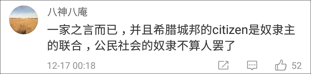 在這名博主的評論區有網友提到,漢字“民”的起源説法只是郭沫若的一家之言罷了,另外希臘城邦的citizen是奴隸主的聯合,公民社會的奴隸並不算人。