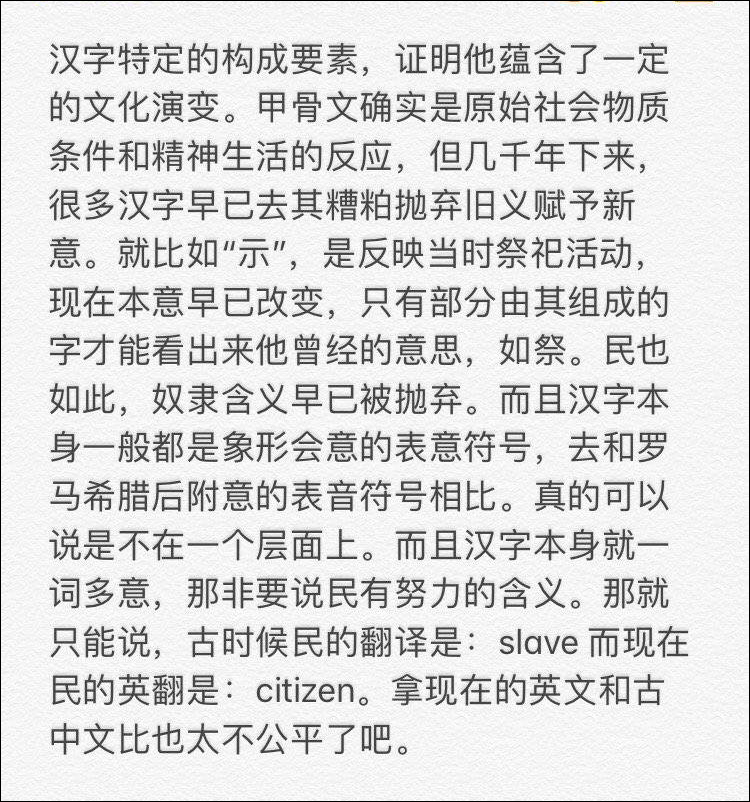 民也如此,奴隸含義早已被拋棄。而且漢字本身一般都是象形會意的表意符號,去和羅馬希臘後附意的表音符號相比,真的可以説是不在一個層面上。而且漢字本身就一詞多意,那非要説民有奴隸的含義,那就只能説,古時候民的翻譯是:slave,而現在民的英翻是:citizen。