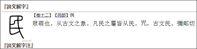 東漢學者許慎所著《説文解字》中收錄了大量先秦古文和秦篆,其中就包括篆文的“民”。在日本早稻田大學所藏的《説文解字》(和刻本)善本中,就有篆文“民”字及其註解:“民,眾氓也,從古文之象”。“氓”,音“萌”,指充當隸役的平民;“眾氓”也做“眾萌”,意思是“一片萌發的小草”,象徵着“民眾”,這也就是篆文中“民”的本意。