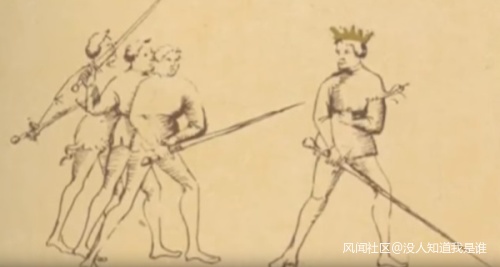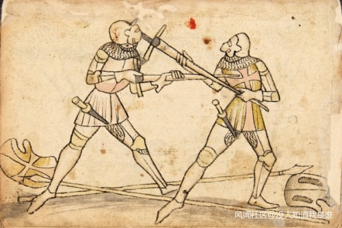 上圖:博洛尼亞單手劍對打,注意雙方劍士都是把拿劍的那隻手暴露在前方。注意博洛尼亞單手劍的形制,橫過來和豎過來的好幾個鐵環,這些鐵環起到了至關重要的效果。