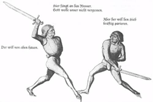 上圖,Hans的Langes Messer(德國長刀,可以理解為一種單手劍)防守姿勢。與Fiore大體上幾乎一致。大家都是把拿劍的那隻手藏在後面或者上方,每次攻擊時都需要把身體轉一下而讓拿劍的那隻手從自己的一邊揮舞到另一邊,這個體系和長劍是幾乎一樣的。在防禦的過程中當兩劍碰在一起時護手能讓自己往前刺同時卡住對方的劍,這點非常重要。