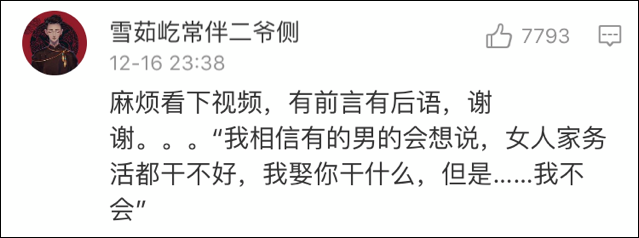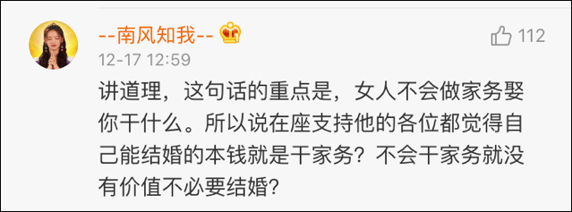 這句話説出來之後,被很多觀眾批評稱“惡臭”:如果你娶老婆只是為了讓她做家務,那你怎麼不去娶保姆?