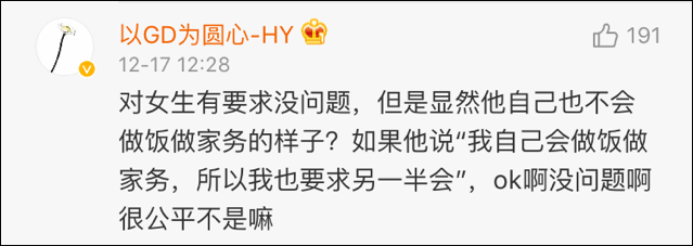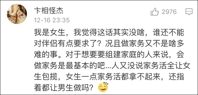 而且他的表述也不太明智,如果他説“我擇偶的標準就是女方會做家務”而不是“不會做家務的女人娶來幹嘛”,相信能接受的人會更多。