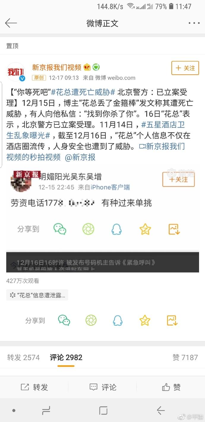 12月15日,博主“花總丟了金箍棒”發文稱其遭死亡威脅,有人向他私信:“找到你殺了你”。16日“花總”表示,北京警方已立案受理。11月14日,五星酒店衞生亂象曝光,截至12月16日,“花總”個人信息不僅在酒店圈流傳,人身安全也遭到了威脅。