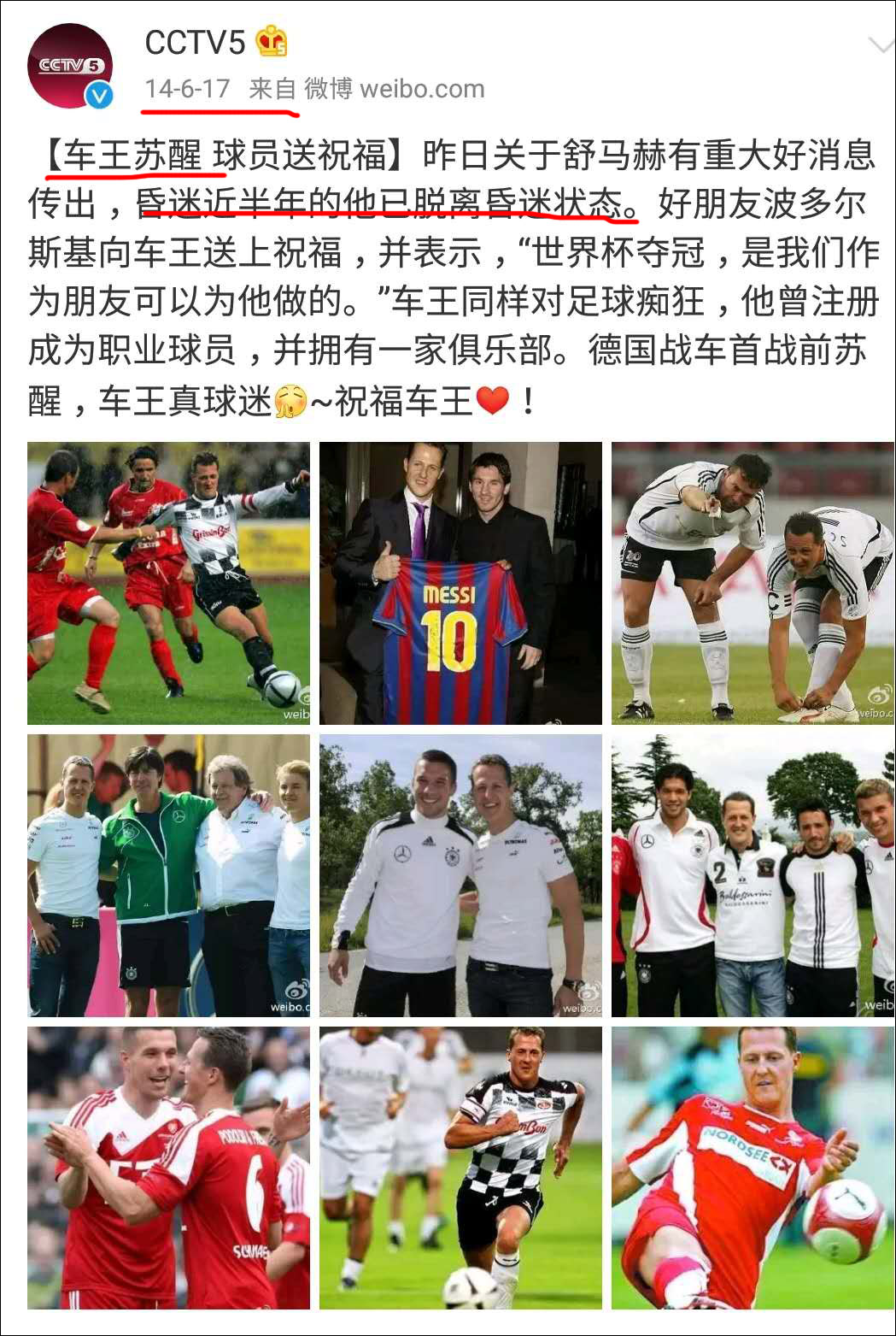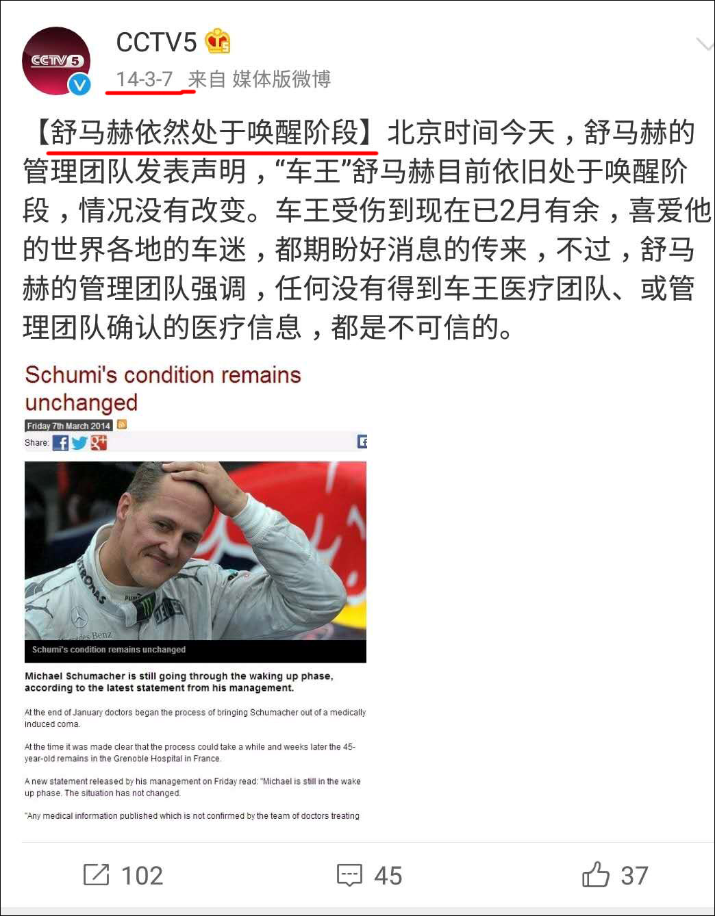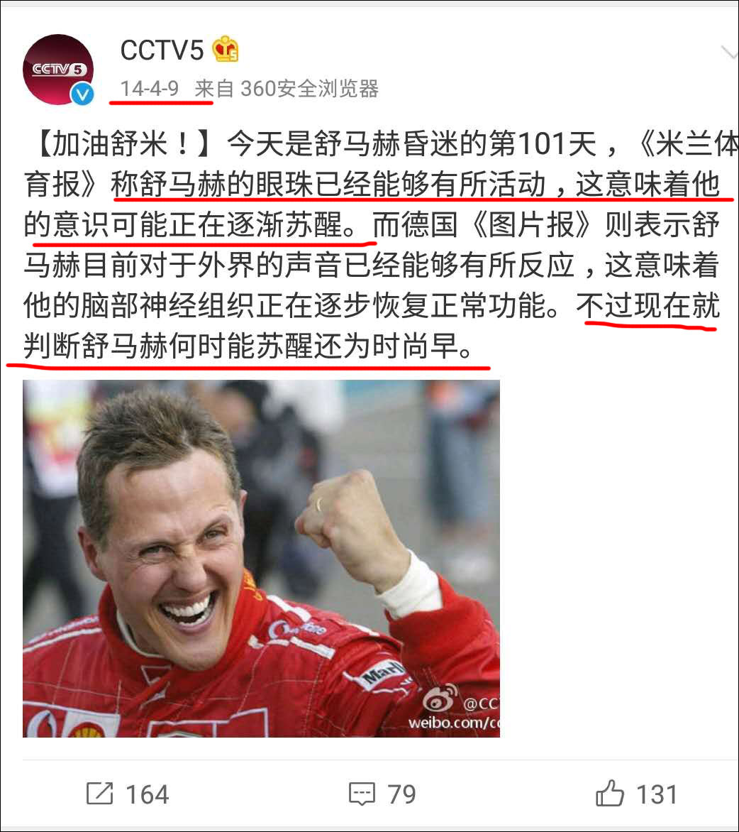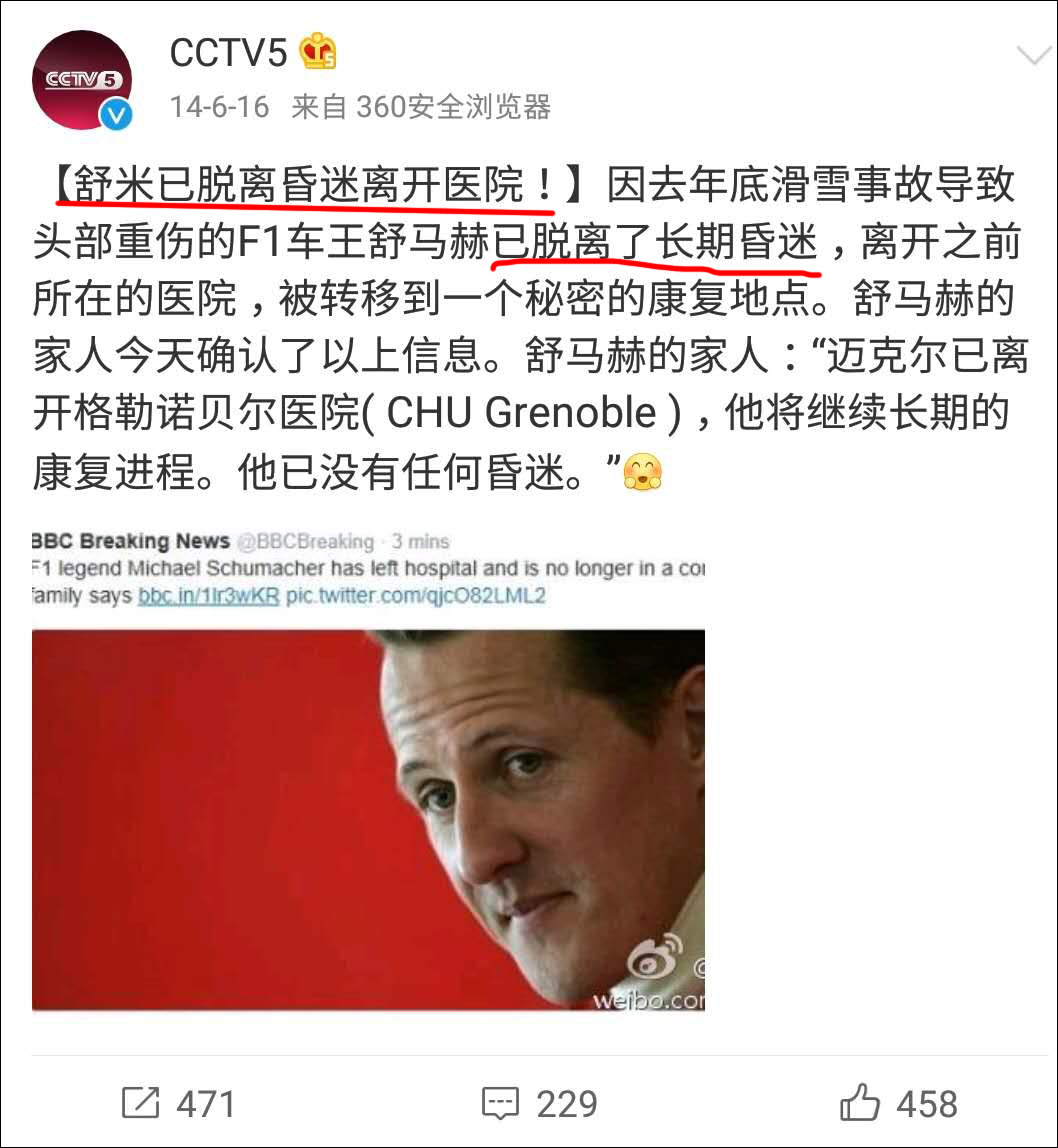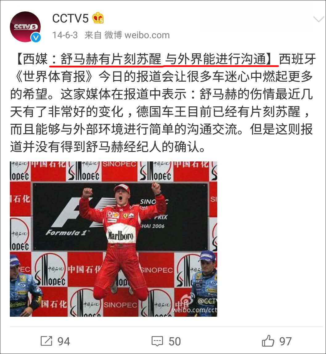 這是2014年6月16日第一次報道舒馬赫甦醒後,@CCTV5第二次在微博報道舒馬赫已經脱離昏迷狀態。