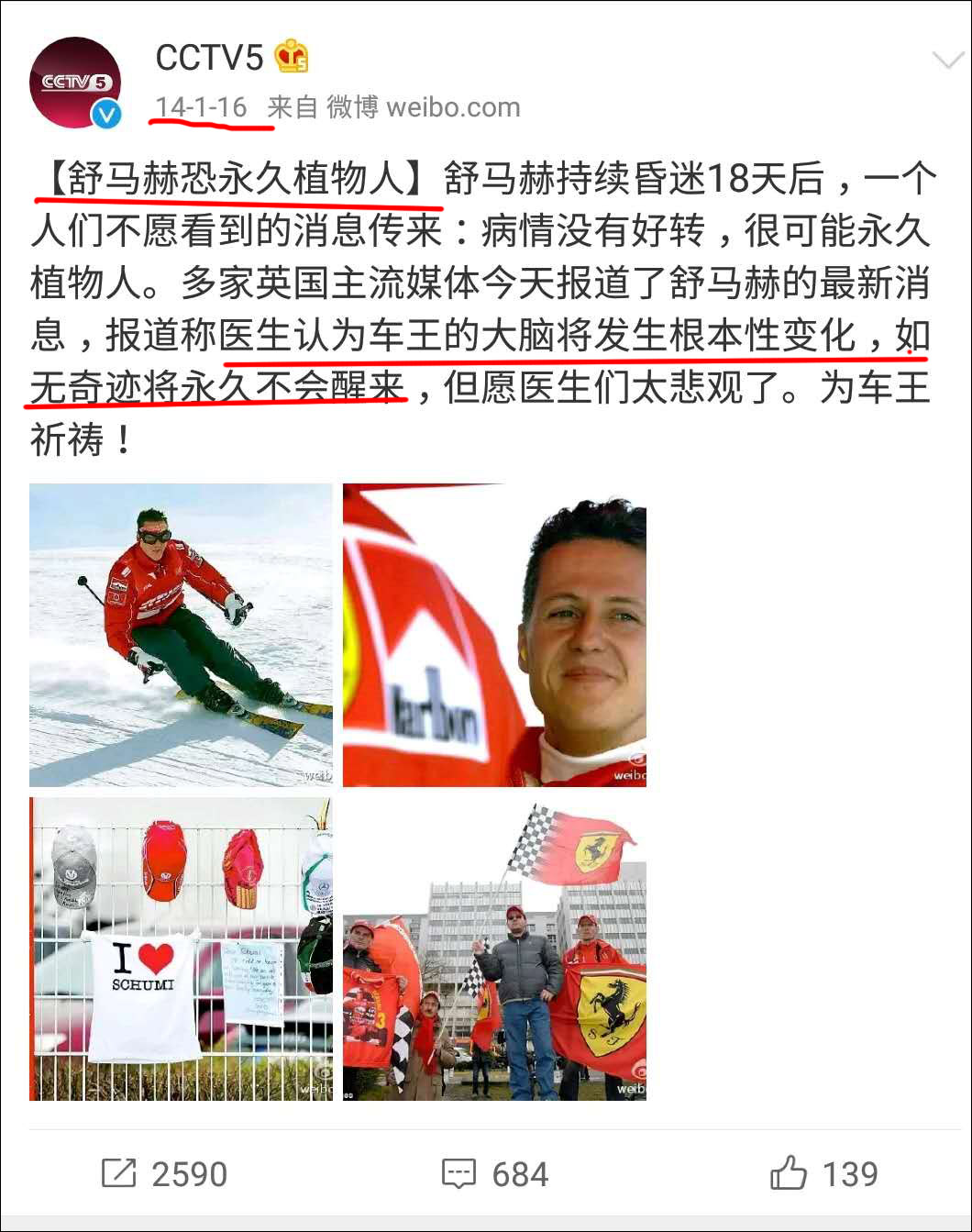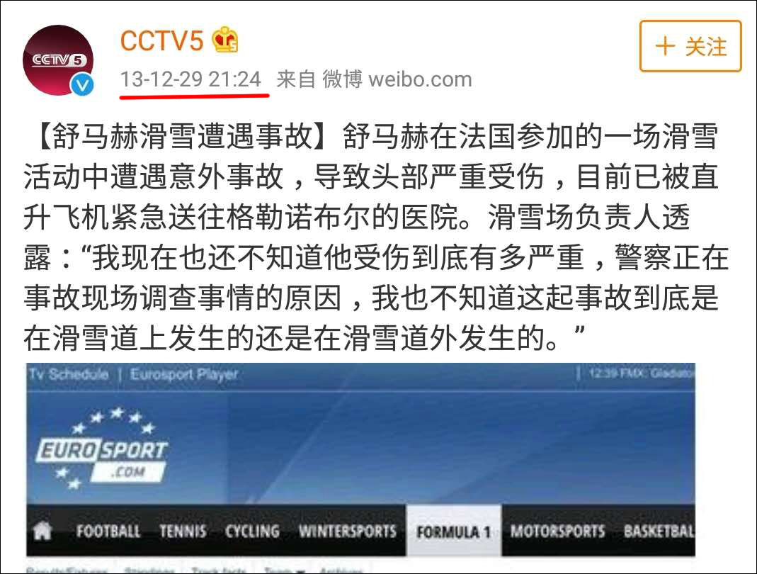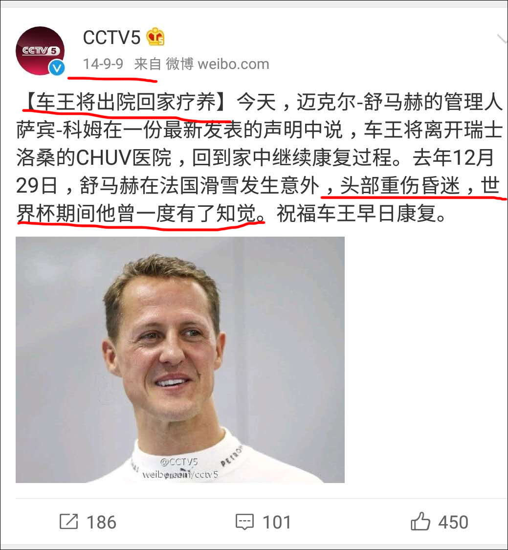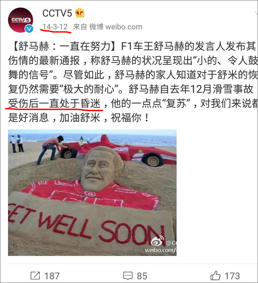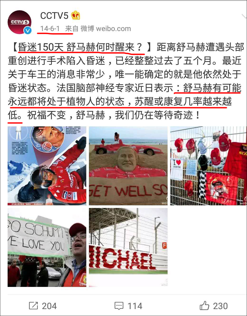 這是2014年6月16日第一次報道舒馬赫甦醒後,@CCTV5第二次在微博報道舒馬赫已經脱離昏迷狀態。