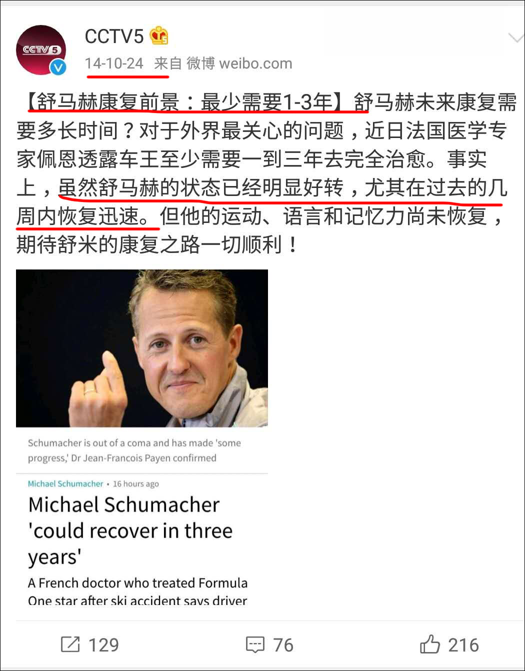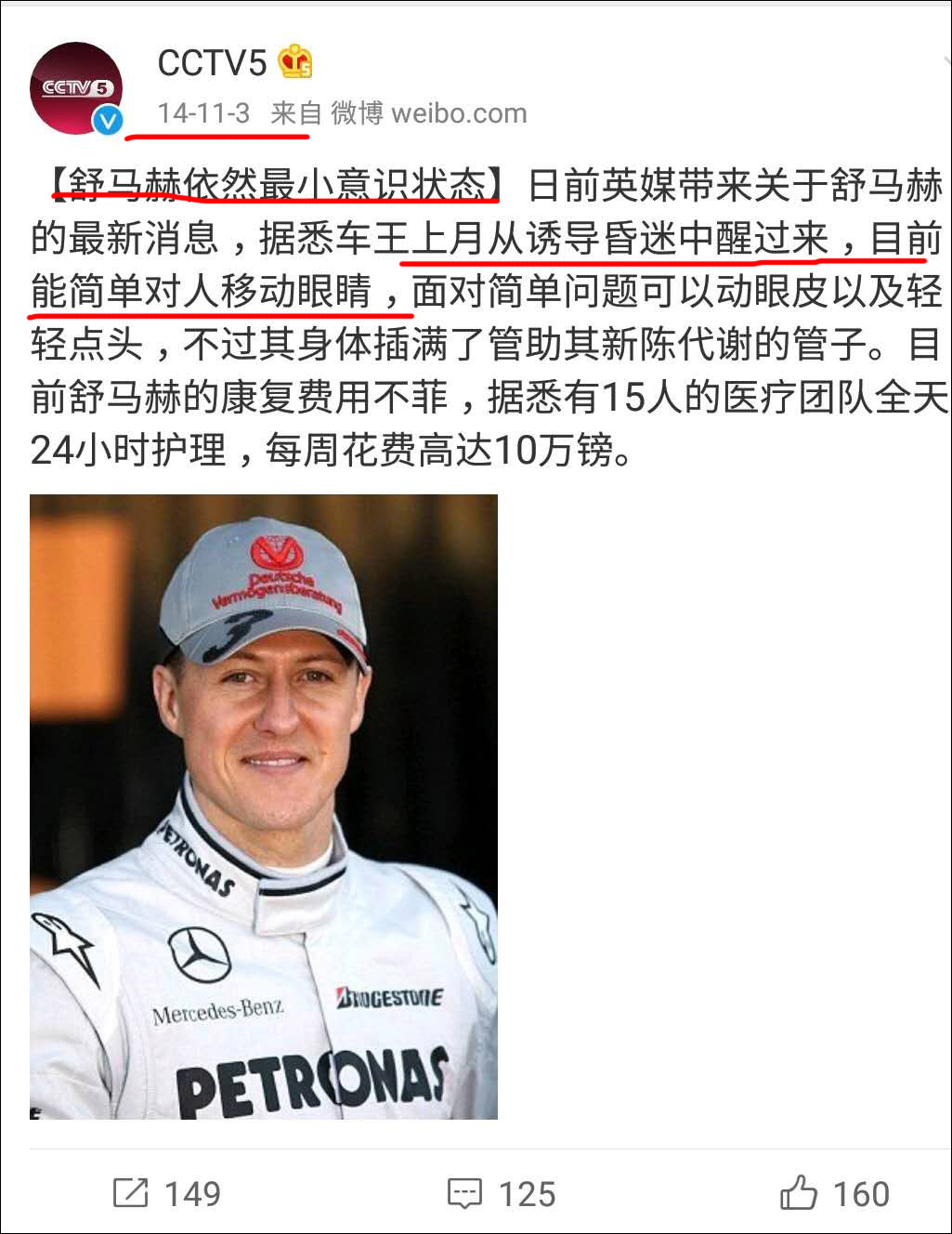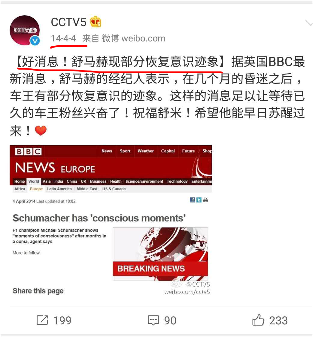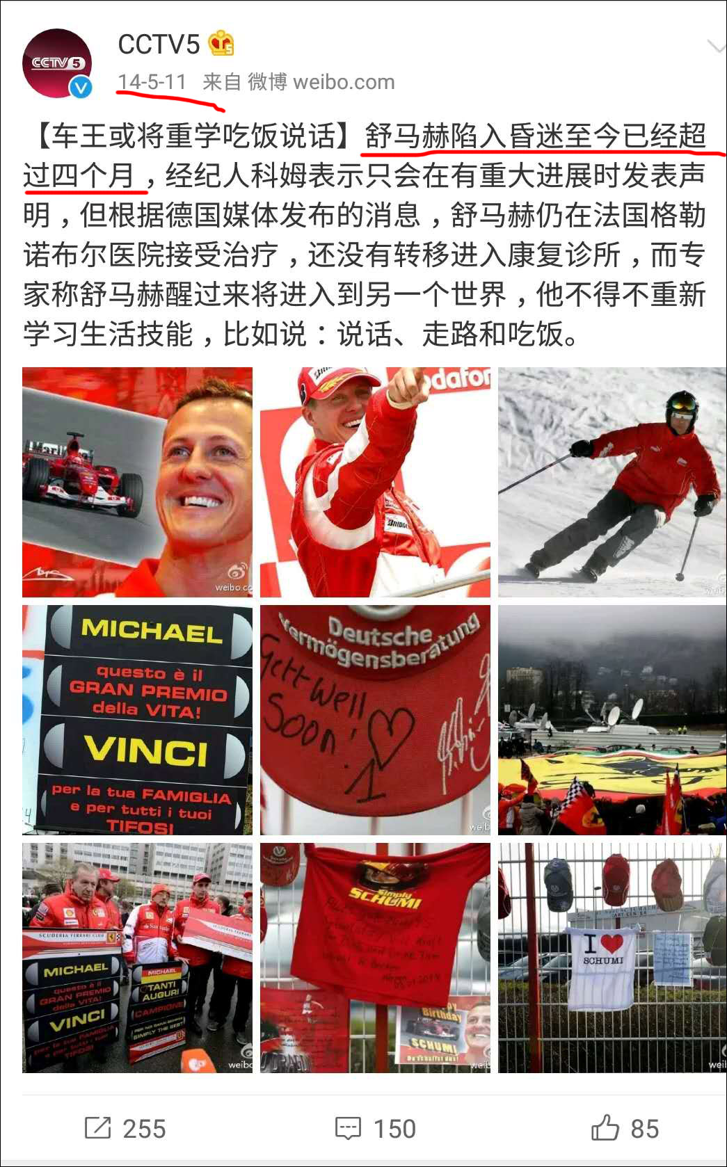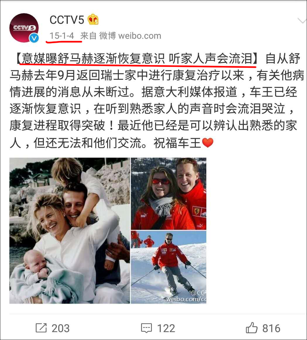 這是2014年6月16日第一次報道舒馬赫甦醒後,@CCTV5第二次在微博報道舒馬赫已經脱離昏迷狀態。