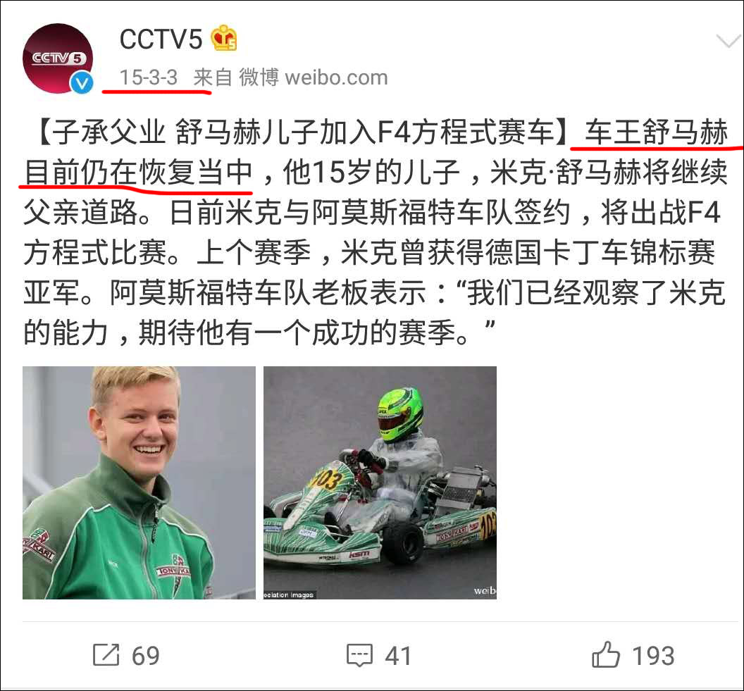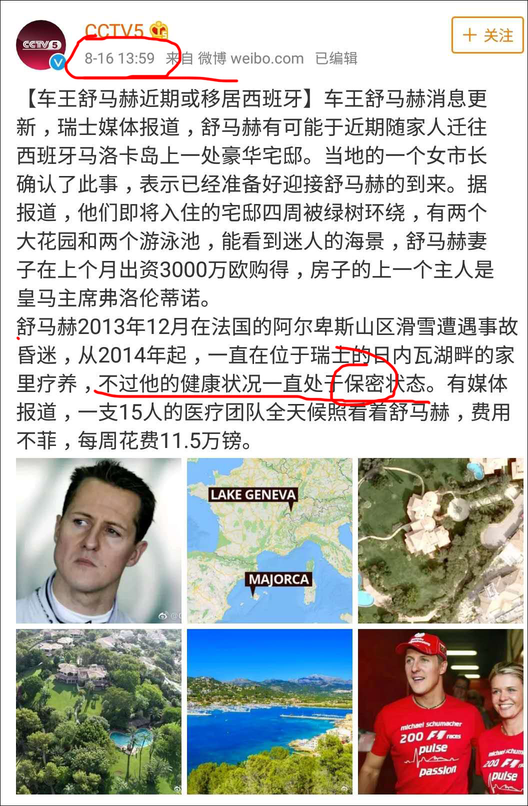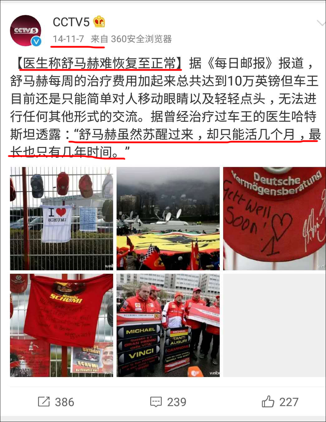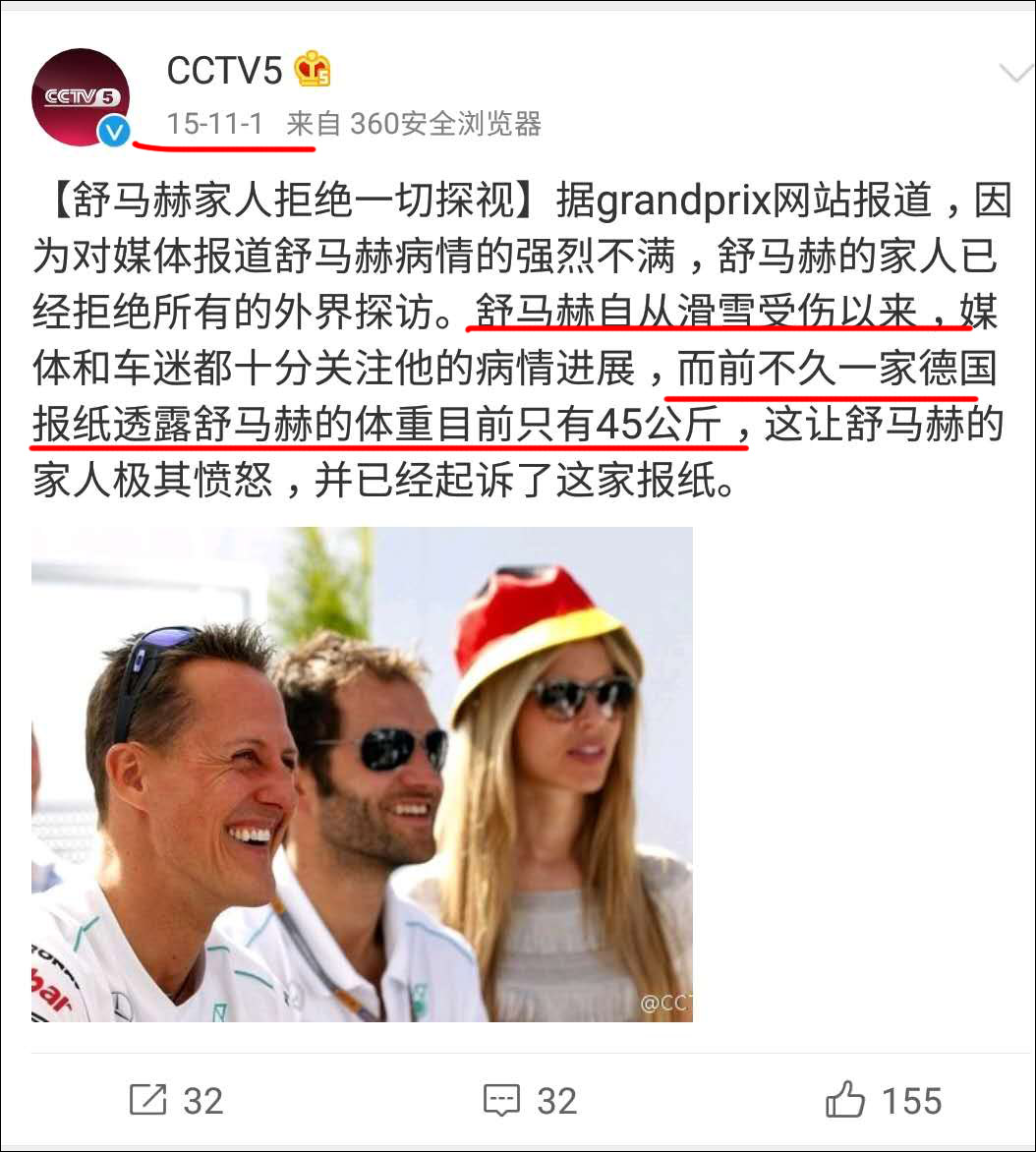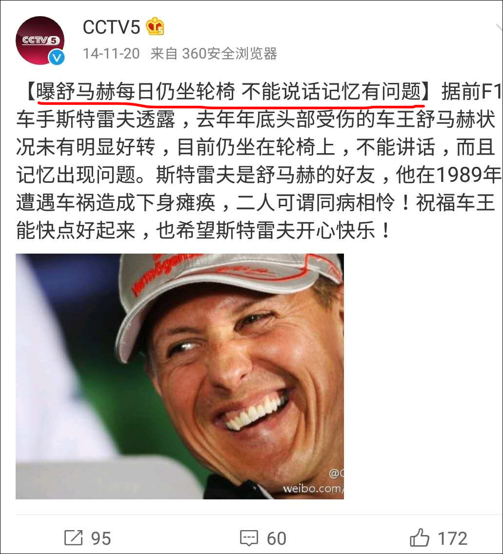 這是2014年6月16日第一次報道舒馬赫甦醒後,@CCTV5第二次在微博報道舒馬赫已經脱離昏迷狀態。
