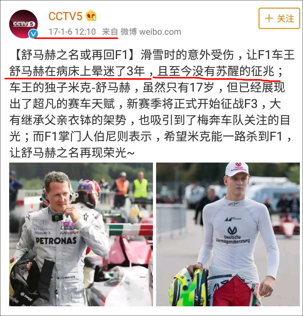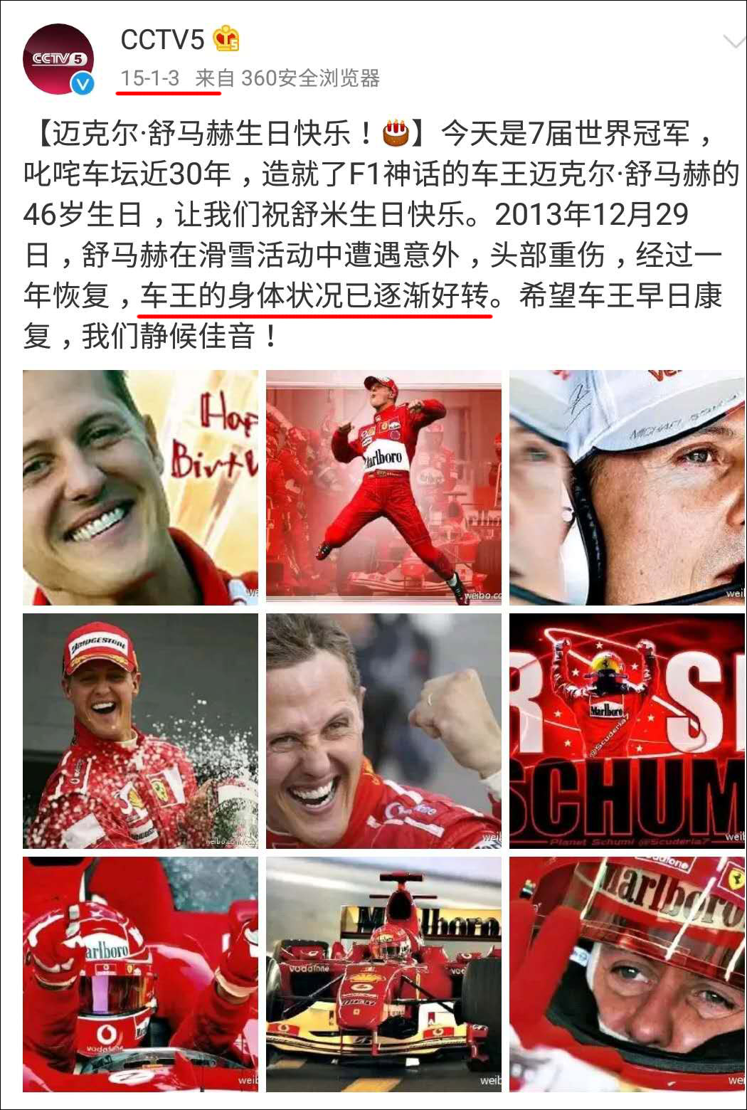 2017年1月6日,CCTV5報道舒馬赫已在病牀上昏迷了3年,至今沒有甦醒的徵兆。