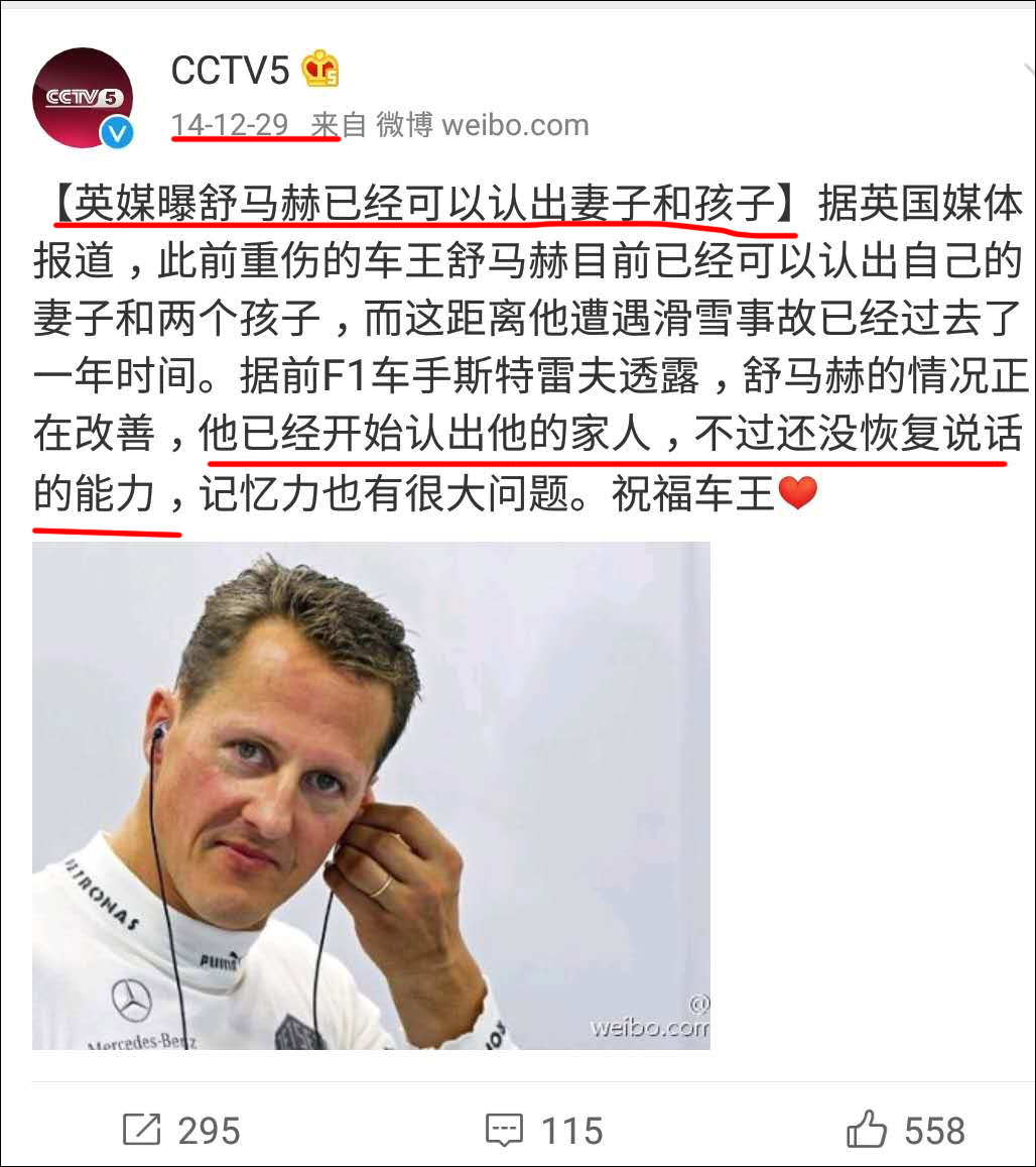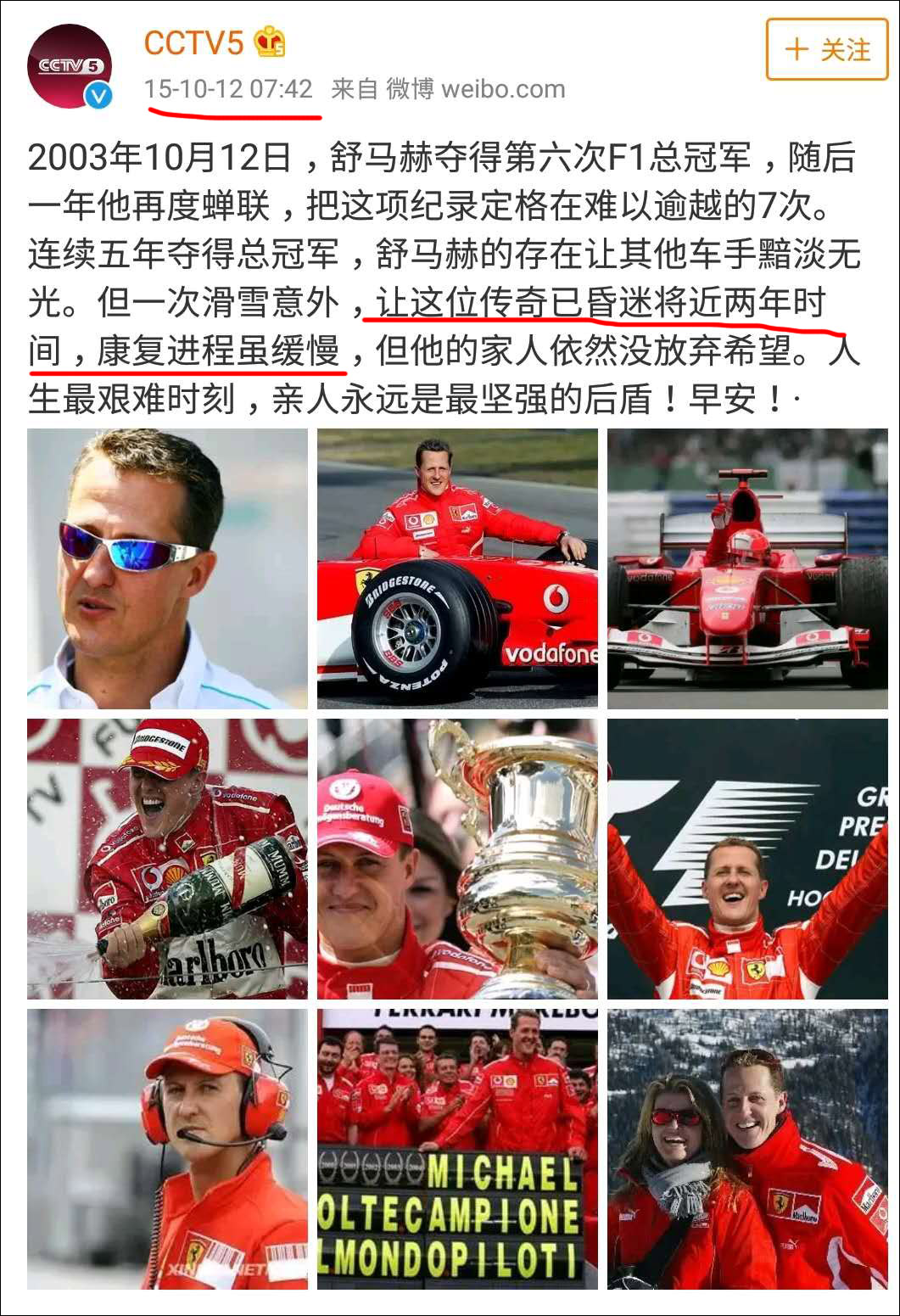 2015年10月12日,CCTV5報道中説,舒馬赫已昏迷近兩年時間,康復進程緩慢。