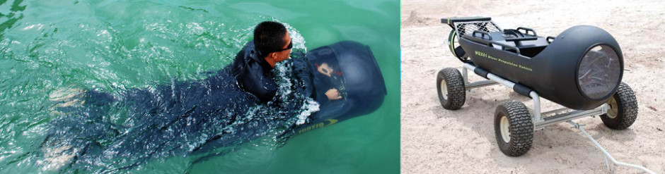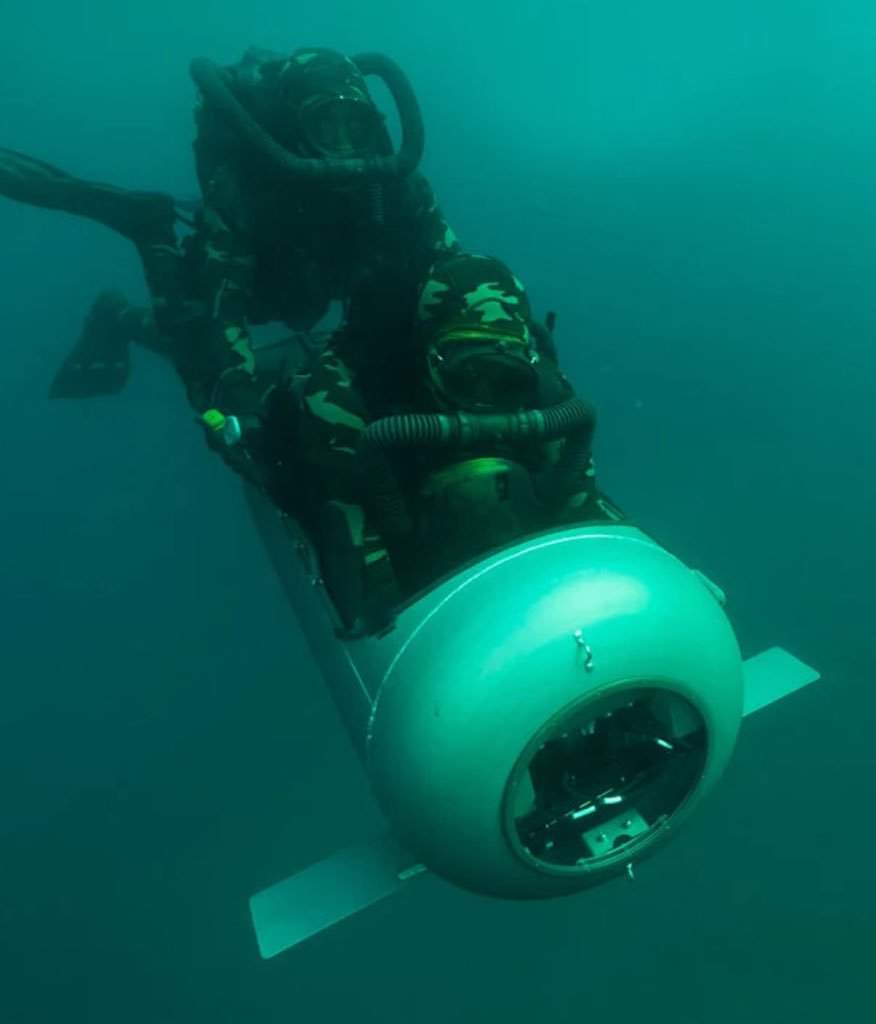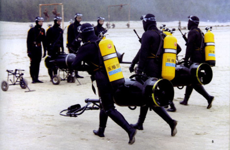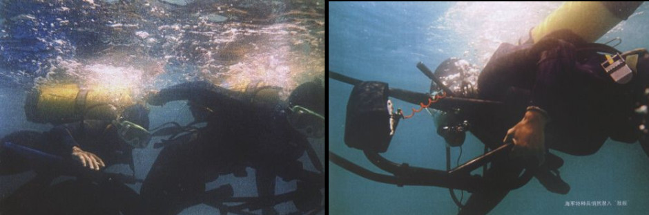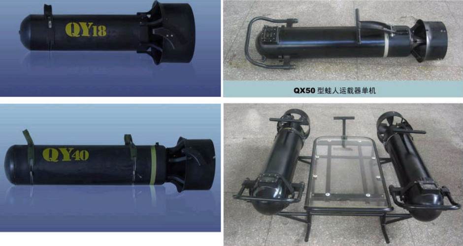 我軍蛙人執行滲透任務,除了前面提到的“水下電動車”,還有這種“水下手扶拖拉機”,這是一種類似俄羅斯特種部隊常用裝備的蛙人運載器,有一個小的航行器,可以拉兩個人在水下走……注意圖中的搭乘姿勢,可以説很手扶拖拉機了……當然也更小,供一個人使用的小型航行器