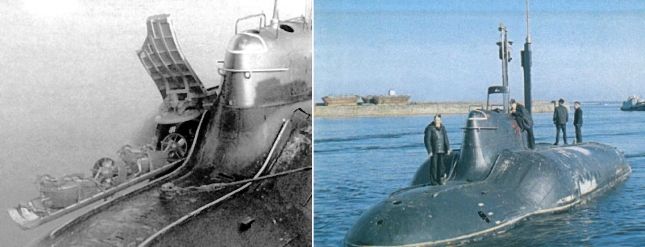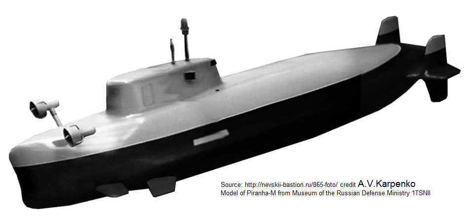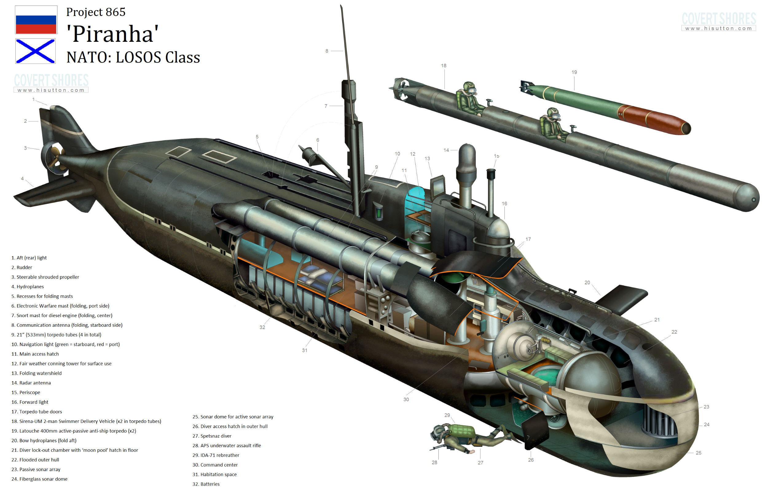 説到微型潛艇呢,就要提一下蘇聯865型“食人魚”級潛艇,該艇堪稱特種作戰方面的萬能潛艇,從圖中可見,該艇的魚雷管安裝在耐壓艇殼外面,通過指揮台圍殼兩側發射,如果任務需要,可以把魚雷管拆掉,換成能搭載2名蛙人的蛙人航行器(類似意大利二戰中的“豬”),同時艇艏則安裝潛水員使用的減壓艙,可以方便潛水員進出潛艇