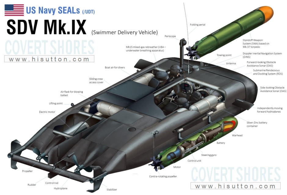 不過美軍也有類似用途的東西,只不過取消了動力系統,直接用SDV潛入敵人軍港,在敵人戰艦下方扔一個定時沉底水雷,可能比發射魚雷更有效一些,至少可以設定幾個小時後,等潛航器自己逃出去了再爆炸……