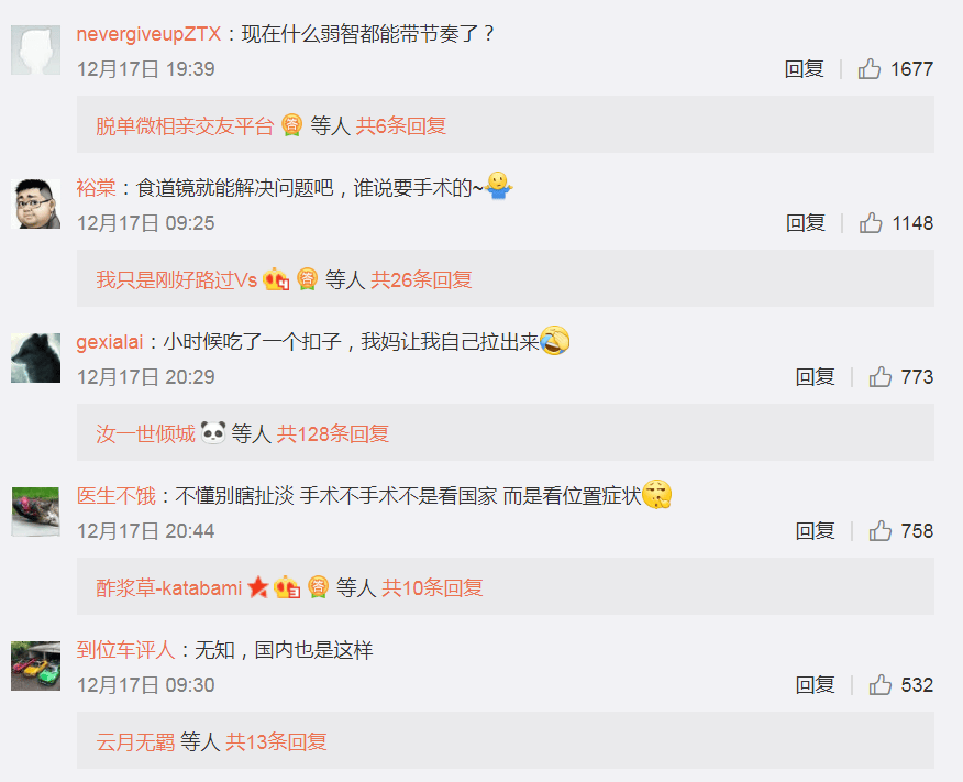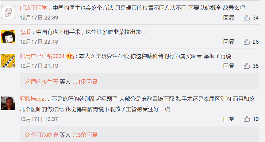 按網友的説法,中國的醫生也會這個方法,而且處理方法不只是吃高纖維食物,還有麻醉胃鏡下取。而這一方法,與手術也是有本質區別的,甚至比視頻中醫生的處理方法,給孩子的主觀感受還會更好一些。