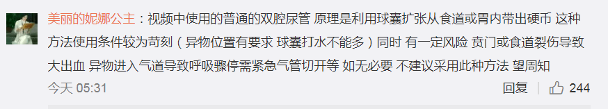 按這位網友的説法,圖中的療法原理為“利用雙腔尿管帶出硬幣”,然而這種療法不僅只是諸多方法中的一種,並且還有較為苛刻的使用條件,同時還伴有一定的風險,比如導致大出血乃至異物進入氣道需緊急器官切開。