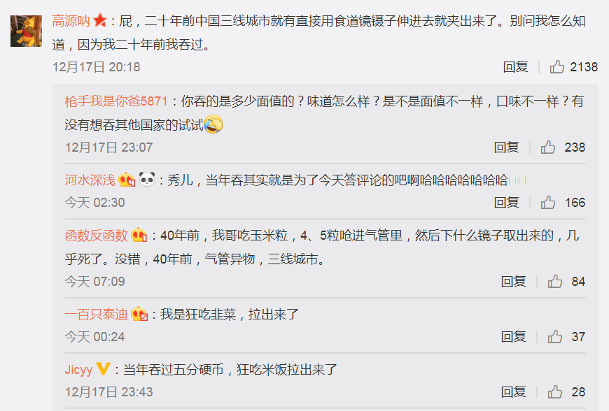 一位網友表示,橡皮管子算什麼,二十年前食道鏡鑷子就能夾出來了……