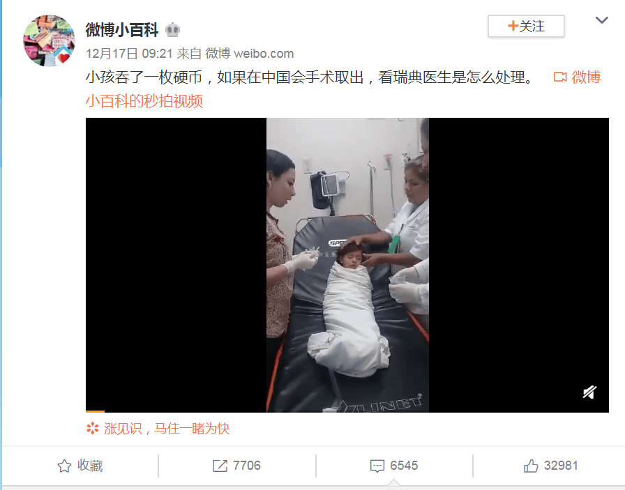 “小孩吞了一枚硬幣,如果在中國會手術取出,看瑞典醫生是怎麼處理。”