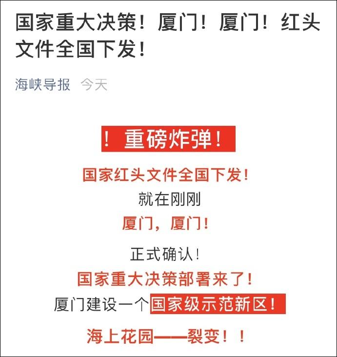 然後,《國家重大決策!廈門!廈門!紅頭文件全國下發!》這樣的標題更是自嗨無腦……